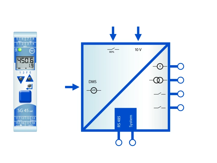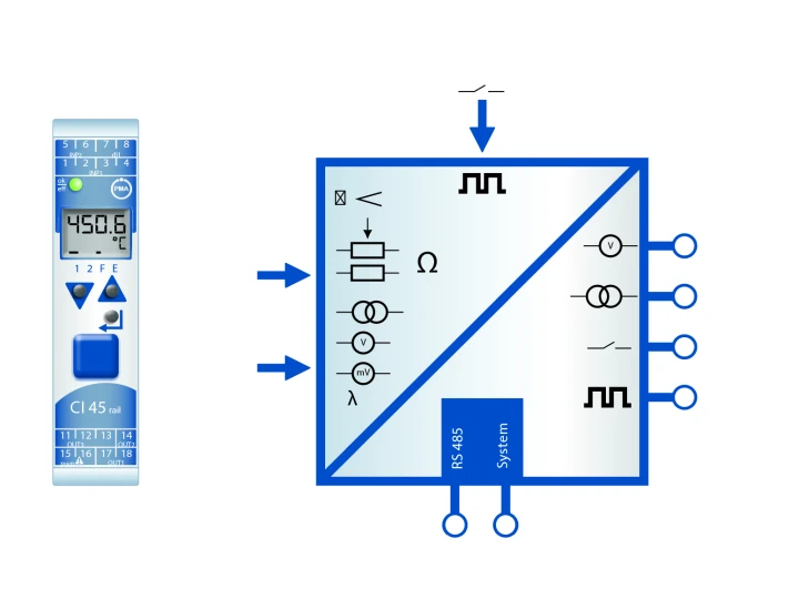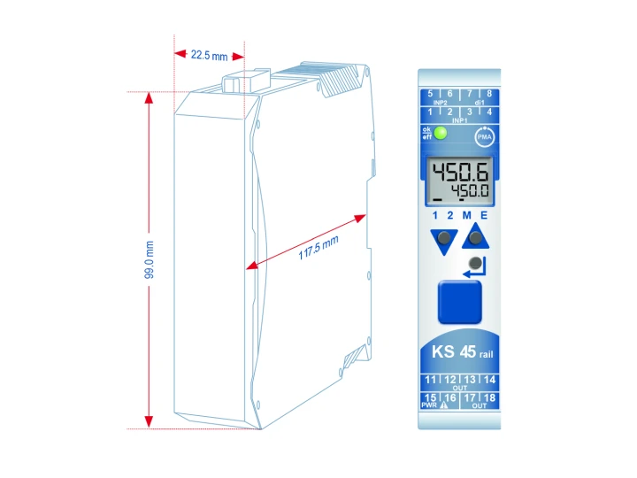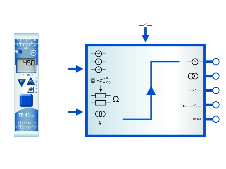 • Se pot combina componente din seria Rail Line: KS45 – regulator industrial universal, TB45 – limitator de siguranță, CI45 – convertor universal, SG45 – pentru celule de sarcină